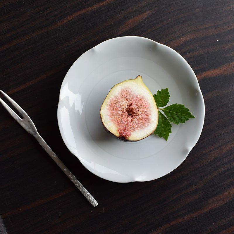 陶器ならではのやさしい白さの粉引に、藍色の染花のアクセント。粉引独特の風合いがあたたかみをもたせ、くっきりとした白と染花の藍色が食卓を明るくします。