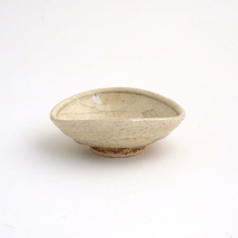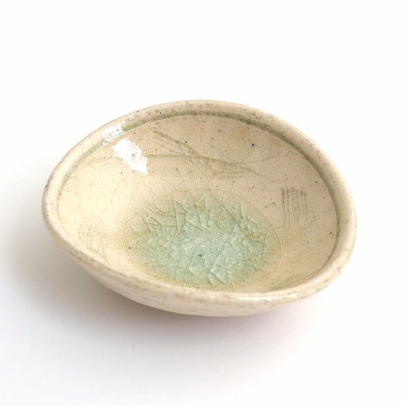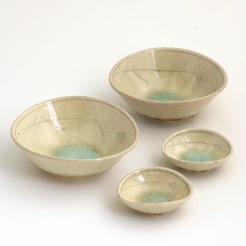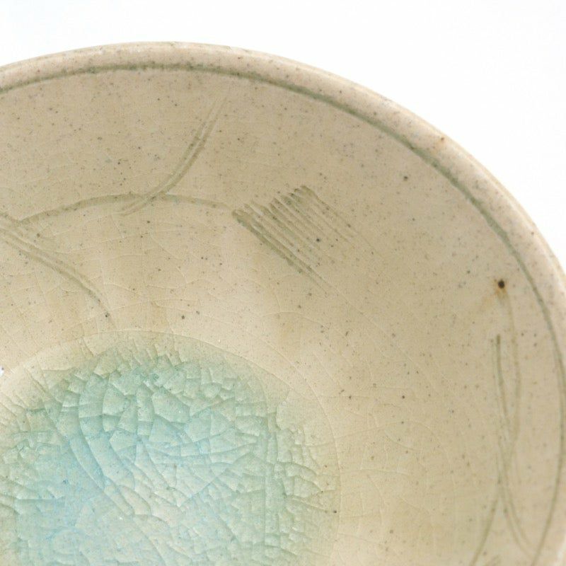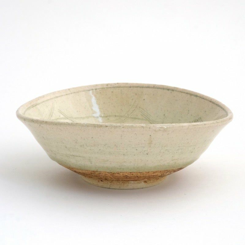 少したわませた楕円の形に、温かみが宿る粉引の器。ひとつひとつ施された線彫りが、器に独特の趣を与えています。「粉引」とは、「粉を引いたように白い」と表現されたことが由来。