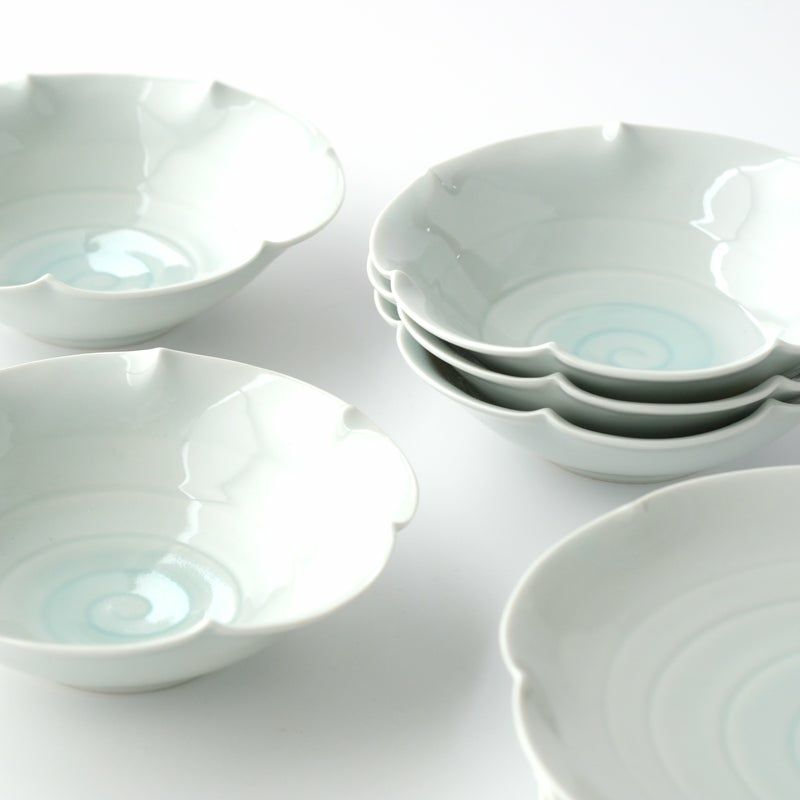 透明感のある青白磁釉の濃淡が描き出す、うず模様のレリーフ。薄く立ち上がった、波打つような縁のあしらい。静かな佇まいの中に、自然が生み出す変化を写し取った器は、暮らしの時間にすっと溶け込みます。悠然とした海のように、飽きの来ない懐の深さも、また魅力。柔らかな曲線が食卓の雰囲気を優しく和ませ、どんな料理とも調和する、清々しい器です。重なりも良く軽く、磁器で扱いやすい器でもあります。