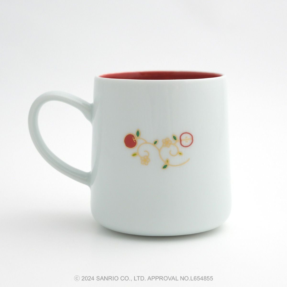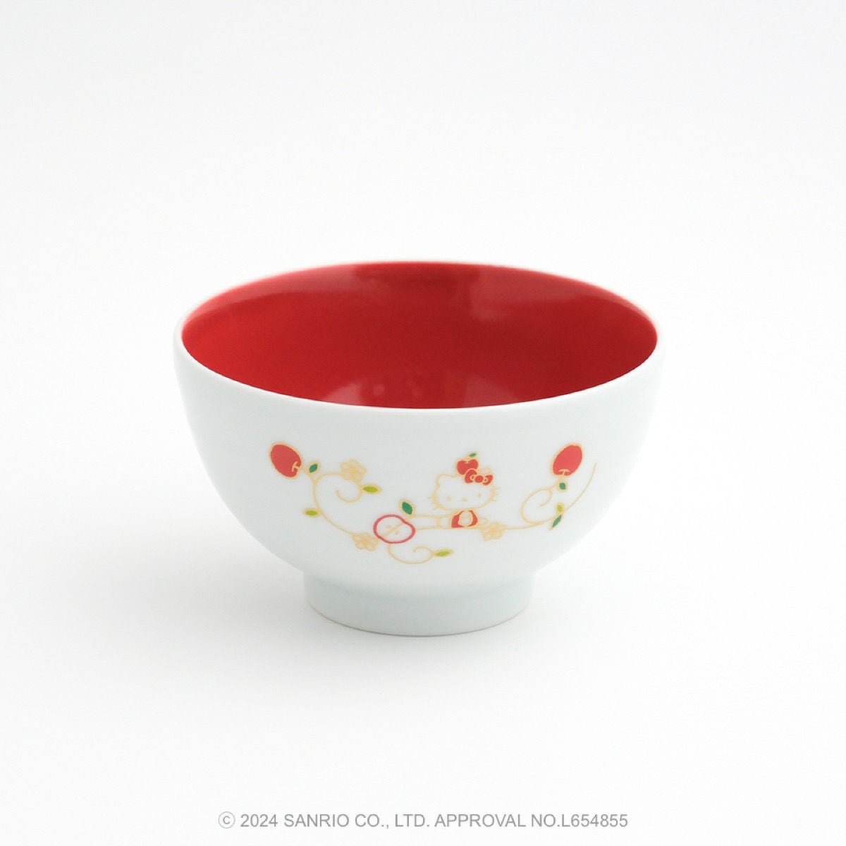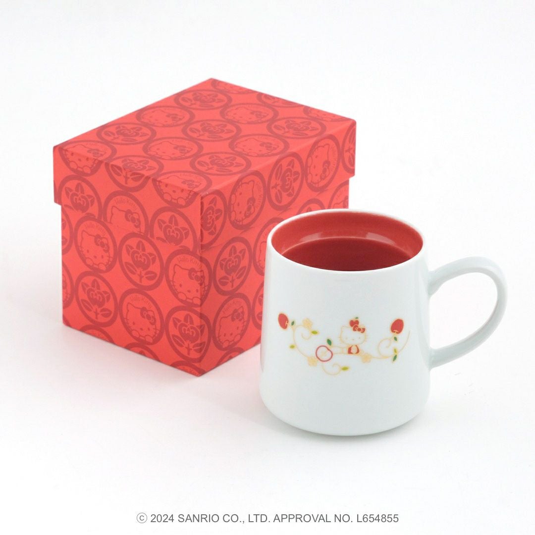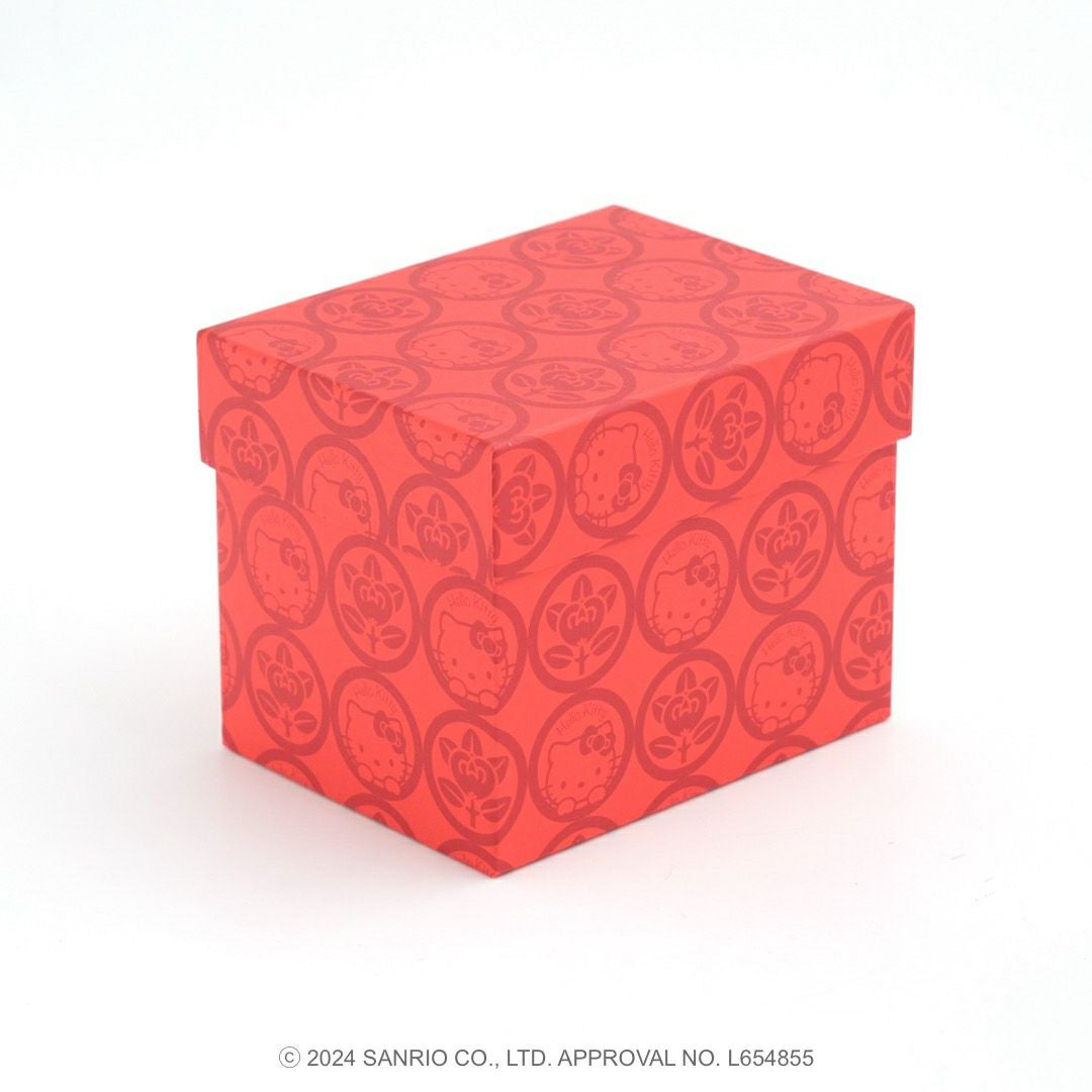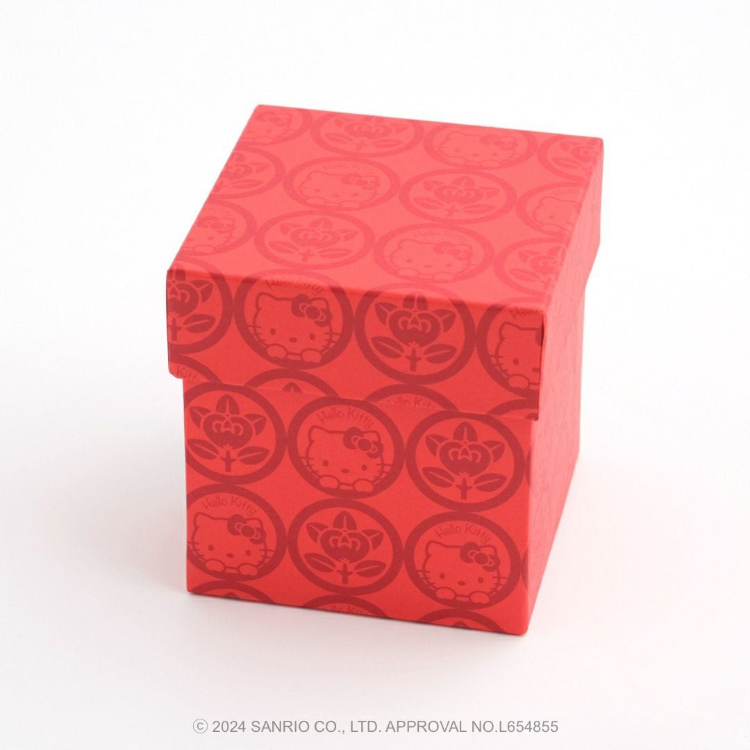 リンゴの唐草文様の中にハローキティがちょこんとお座りしているかわいいデザインです。ハローキティと吉祥文様の唐草に、おだやかで楽しい時間がずっと続きますようにとの願いをこめました。