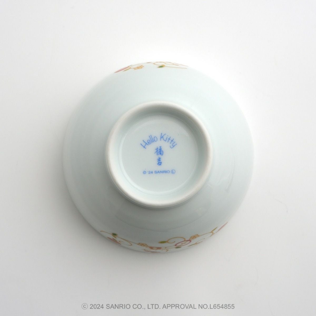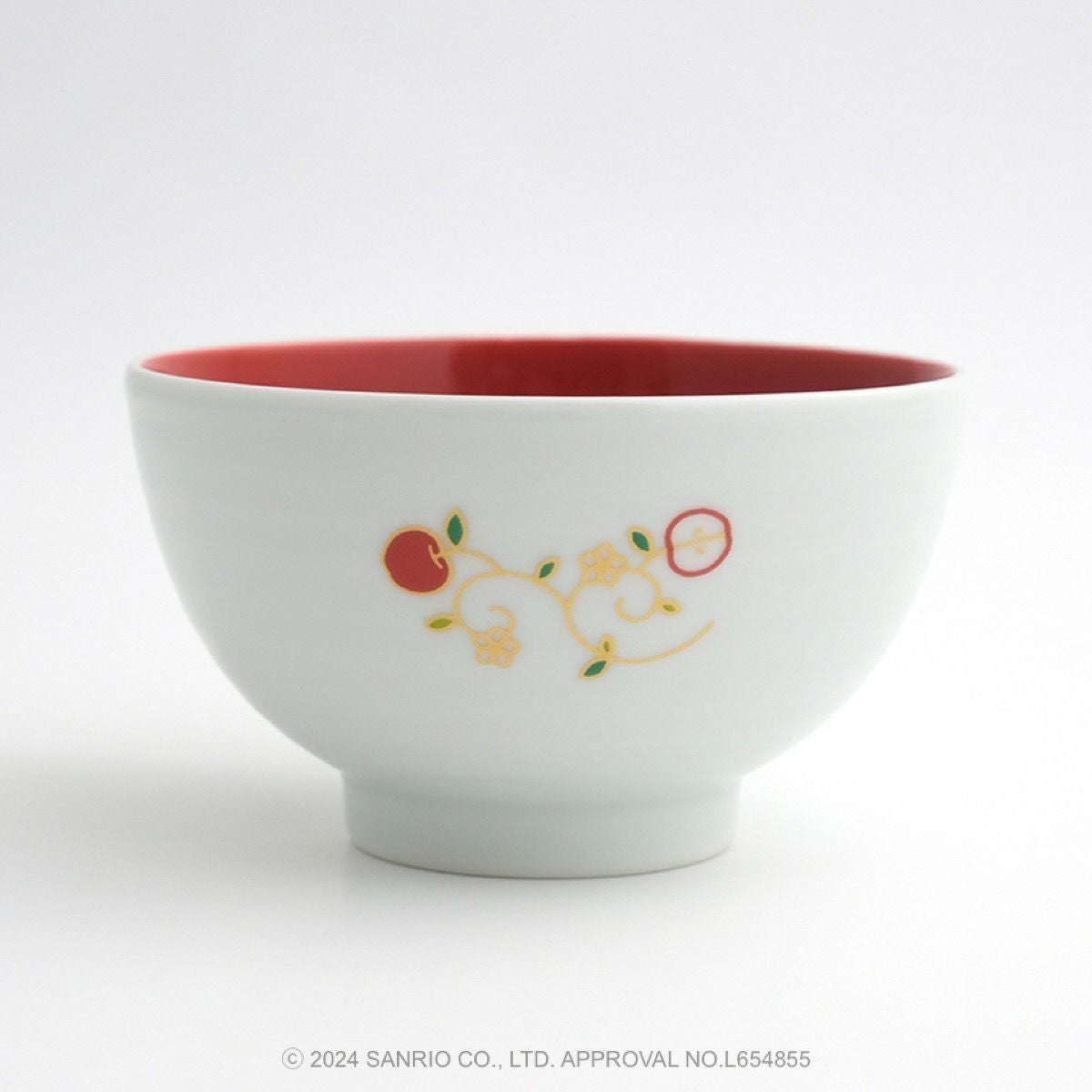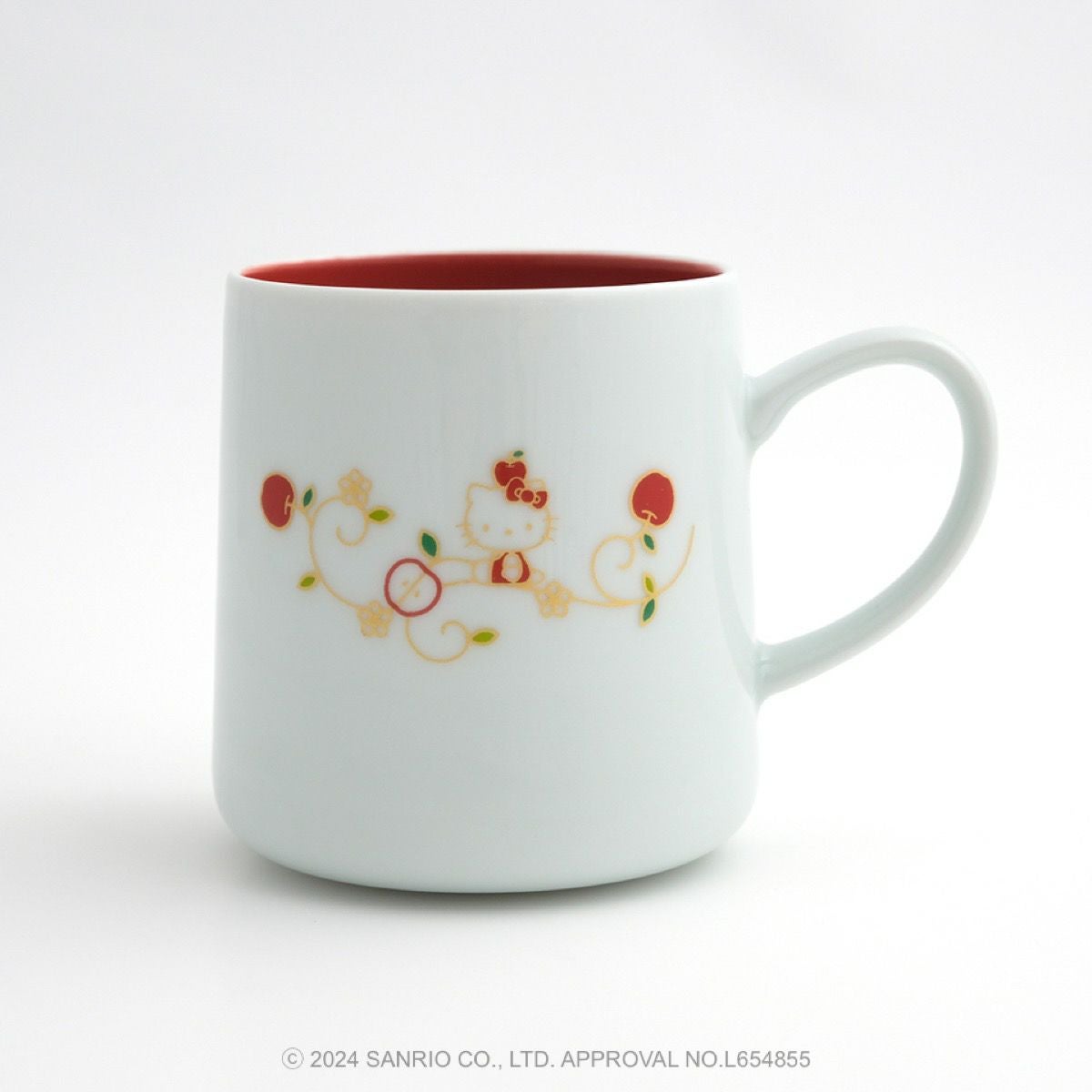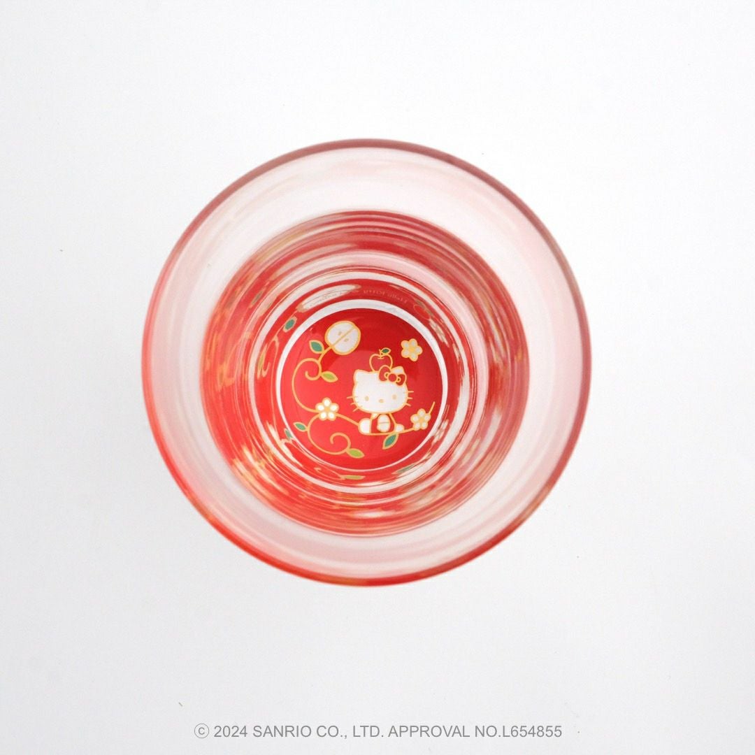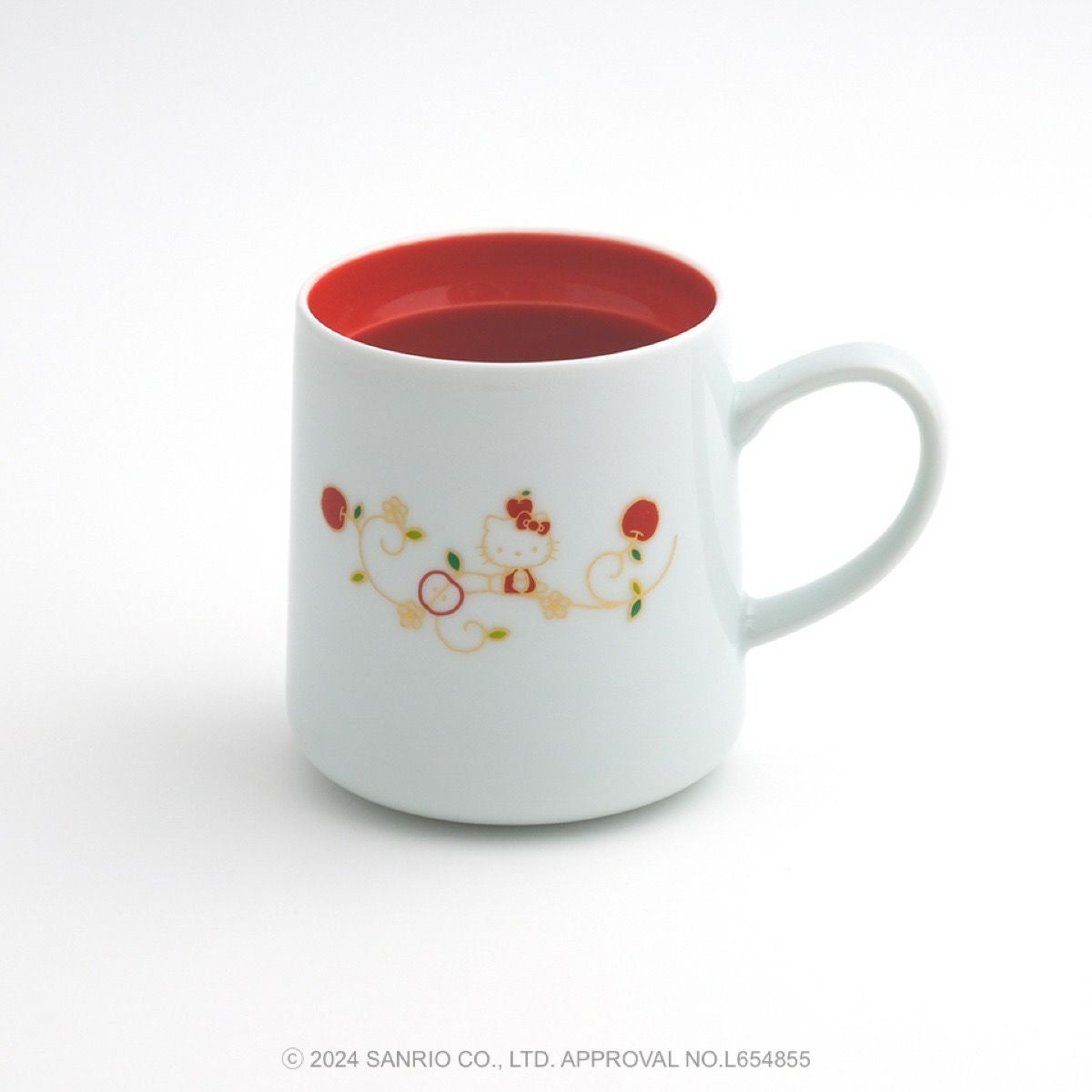 リンゴの唐草文様の中にハローキティがちょこんとお座りしているかわいいデザインです。ハローキティと吉祥文様の唐草に、おだやかで楽しい時間がずっと続きますようにとの願いをこめました。