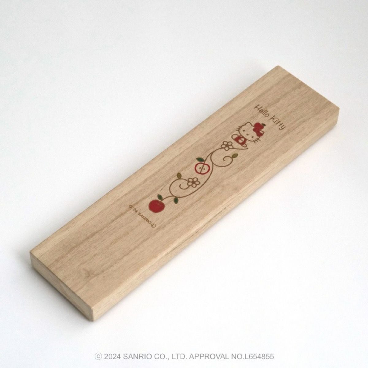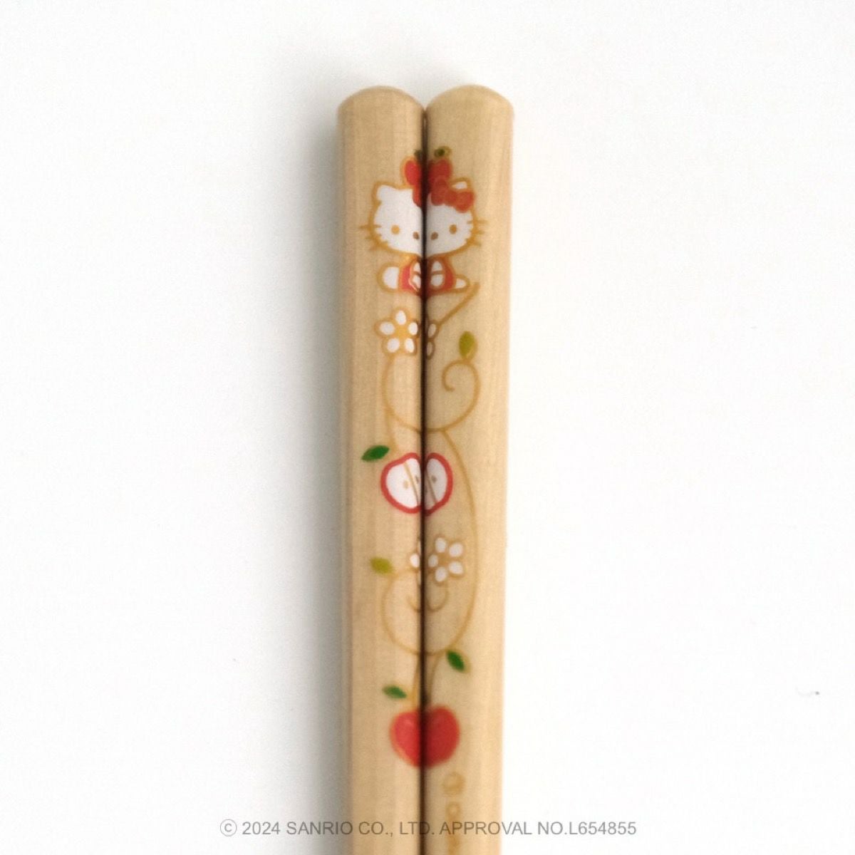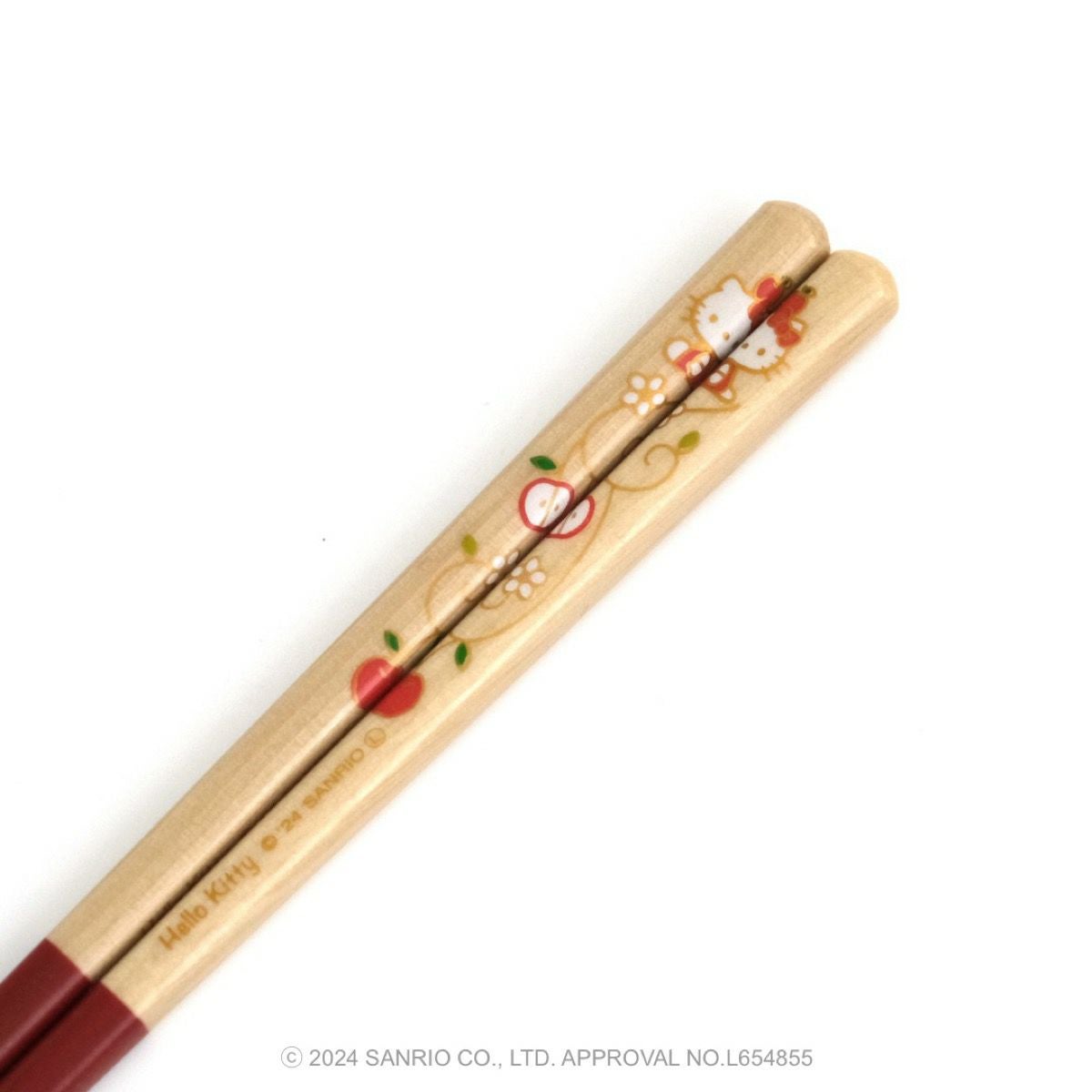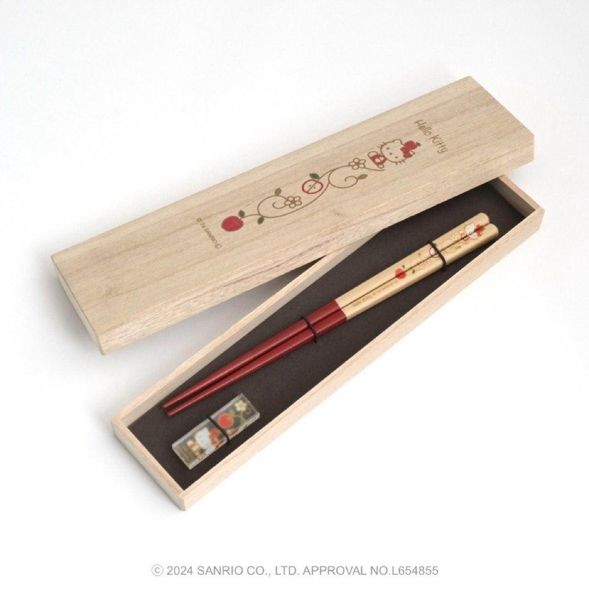 リンゴの唐草文様の中にハローキティがちょこんとお座りしているかわいいデザインです。ハローキティと吉祥文様の唐草に、おだやかで楽しい時間がずっと続きますようにとの願いをこめました。
