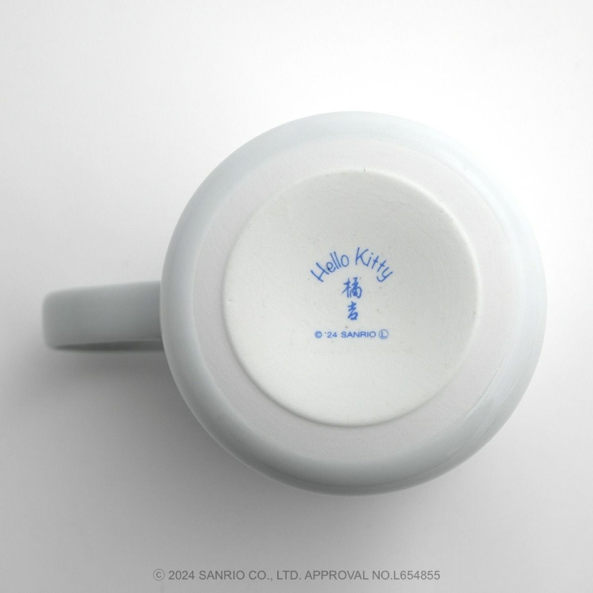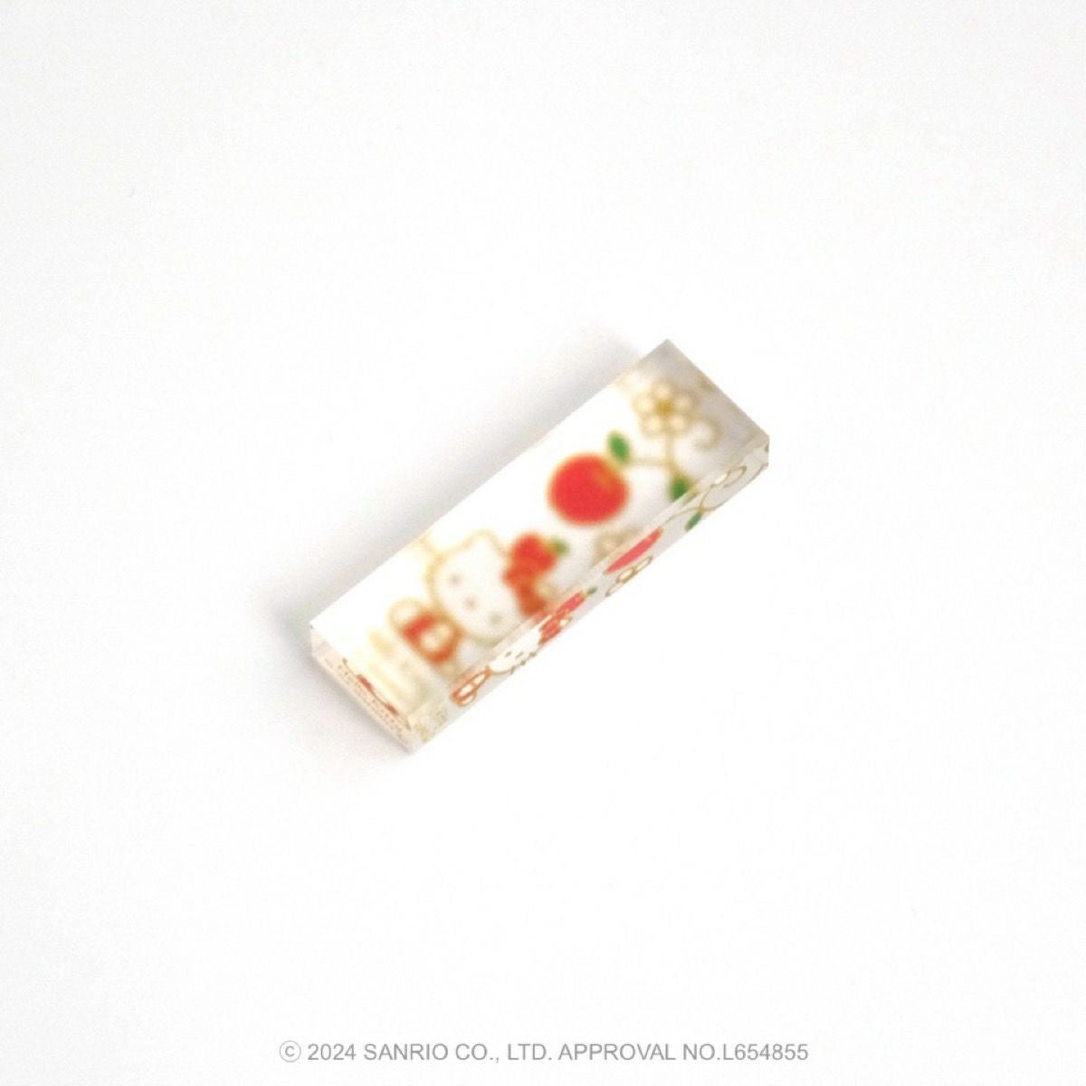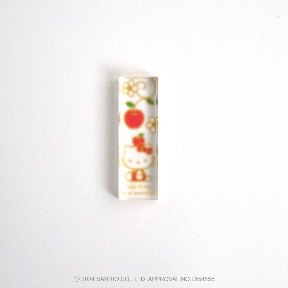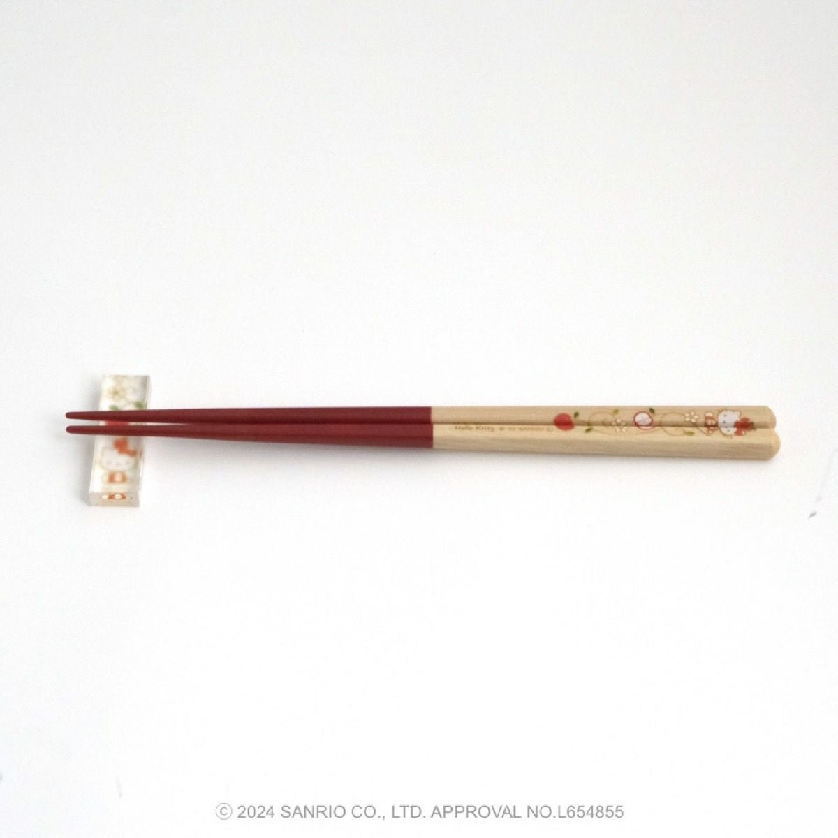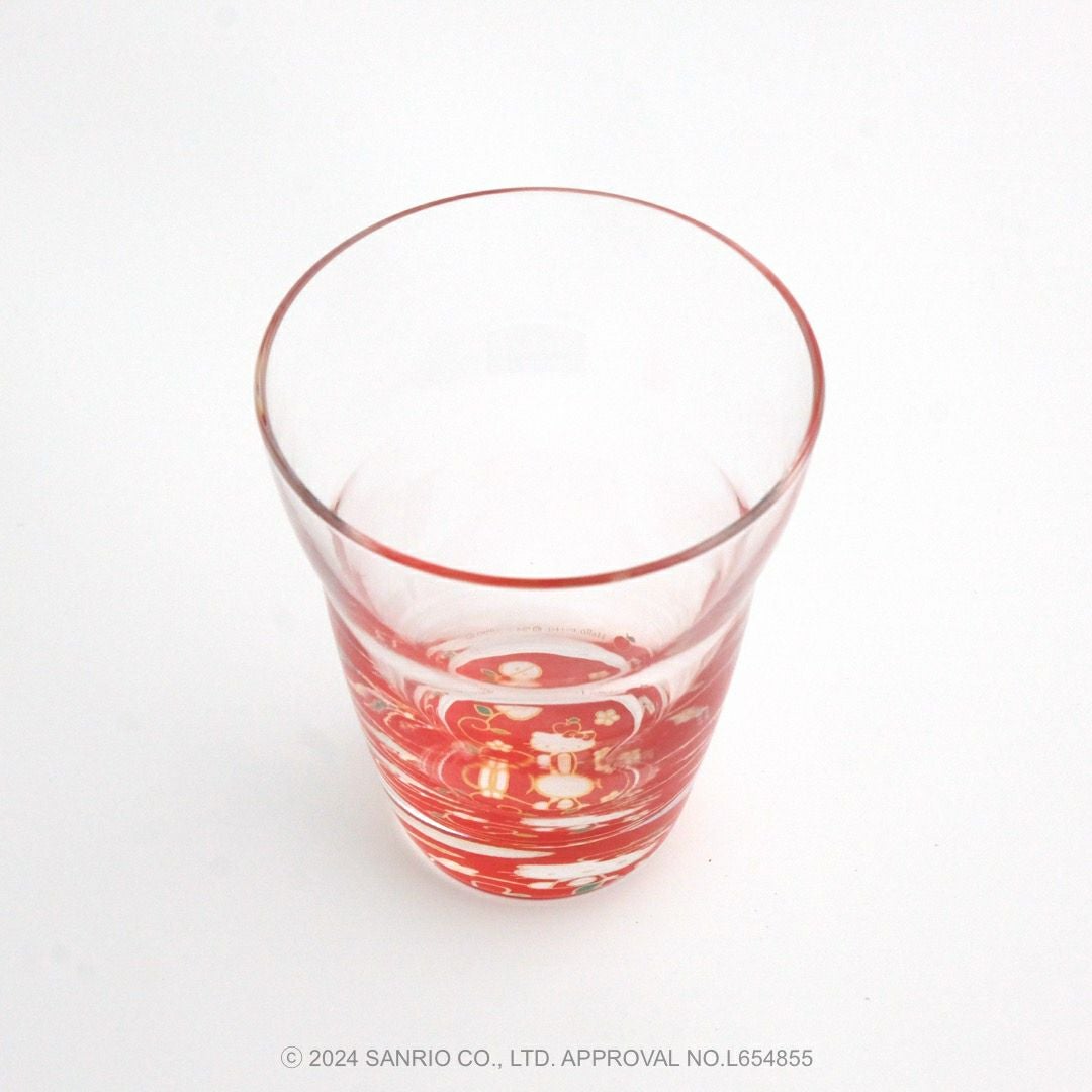 リンゴの唐草文様の中にハローキティがちょこんとお座りしているかわいいデザインです。ハローキティと吉祥文様の唐草に、おだやかで楽しい時間がずっと続きますようにとの願いをこめました。