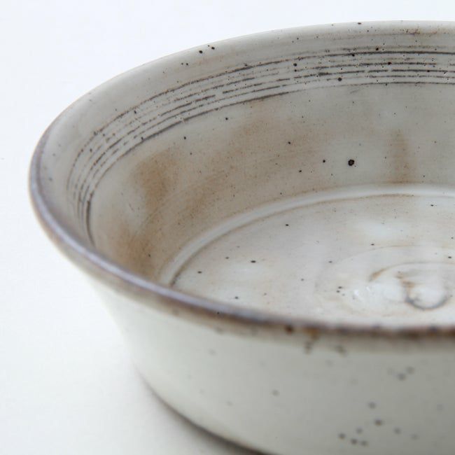 少したわませた楕円の形に、温かみが宿る粉引の器。ひとつひとつ施された線彫りが、器に独特の趣を与えています。「粉引」とは、「粉を引いたように白い」と表現されたことが由来。