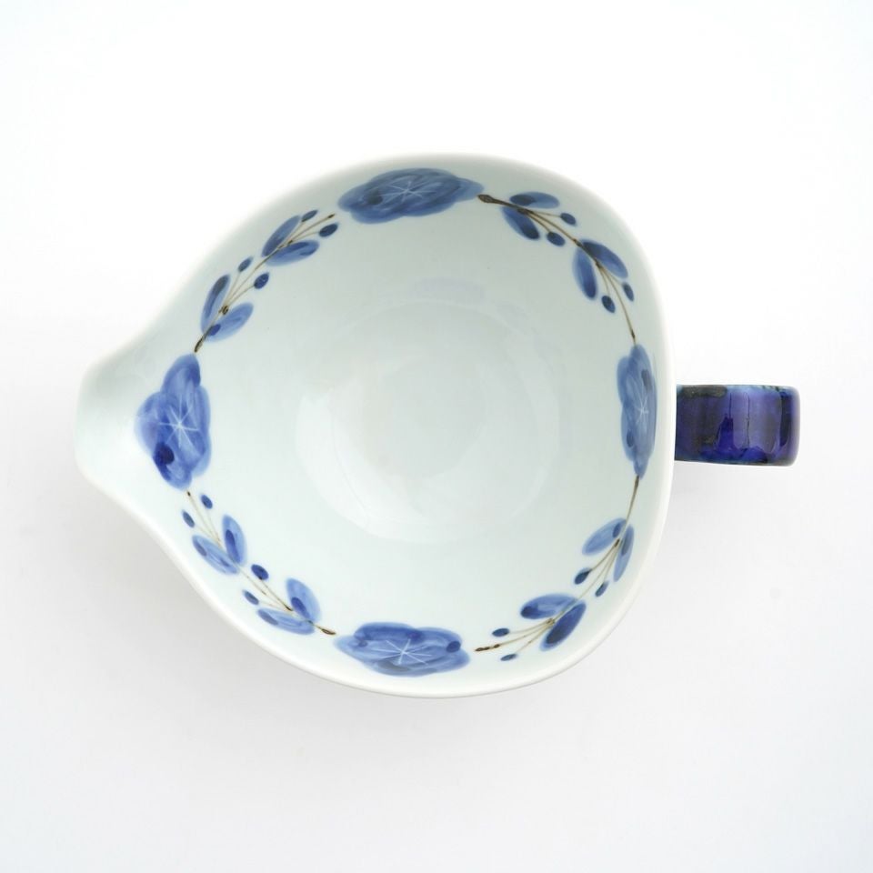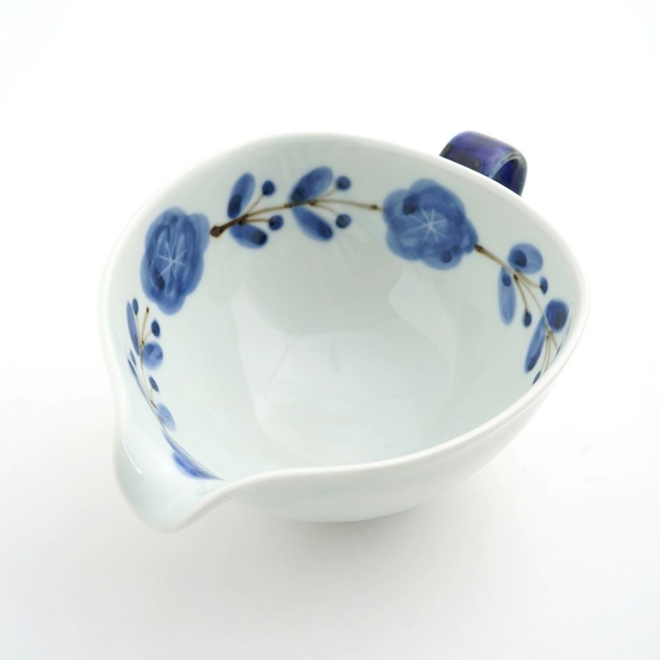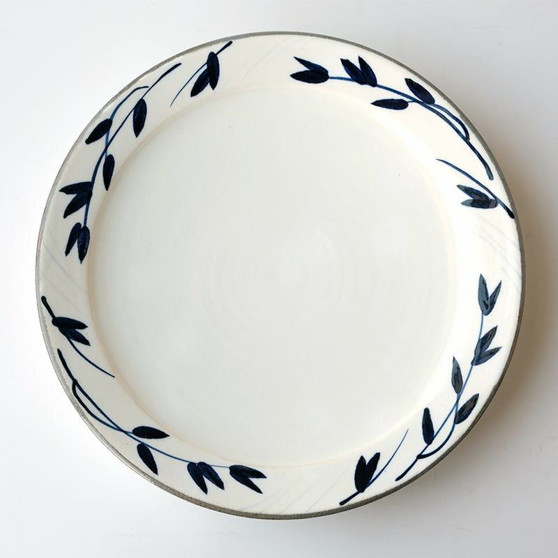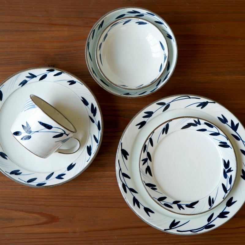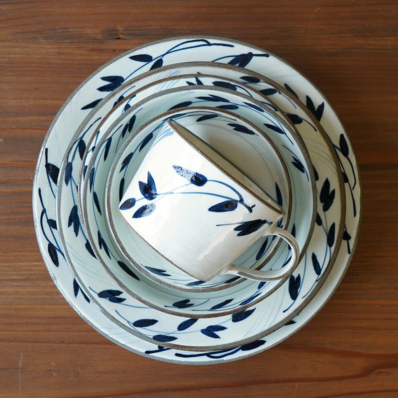 陶器ならではのやさしい白さの粉引に、藍色の染花のアクセント。粉引独特の風合いがあたたかみをもたせ、くっきりとした白と染花の藍色が食卓を明るくします。