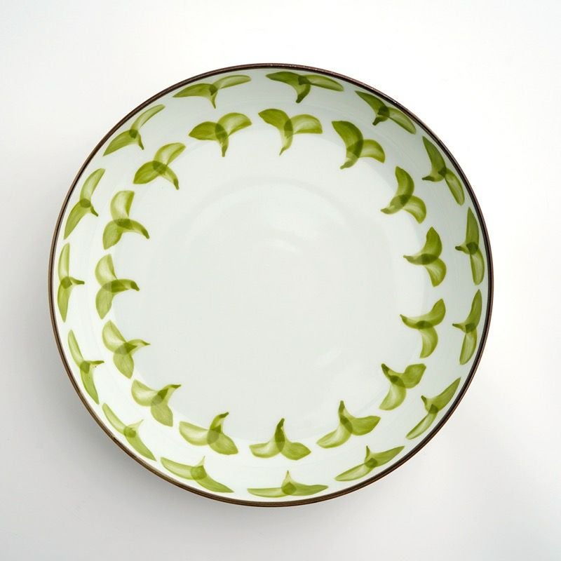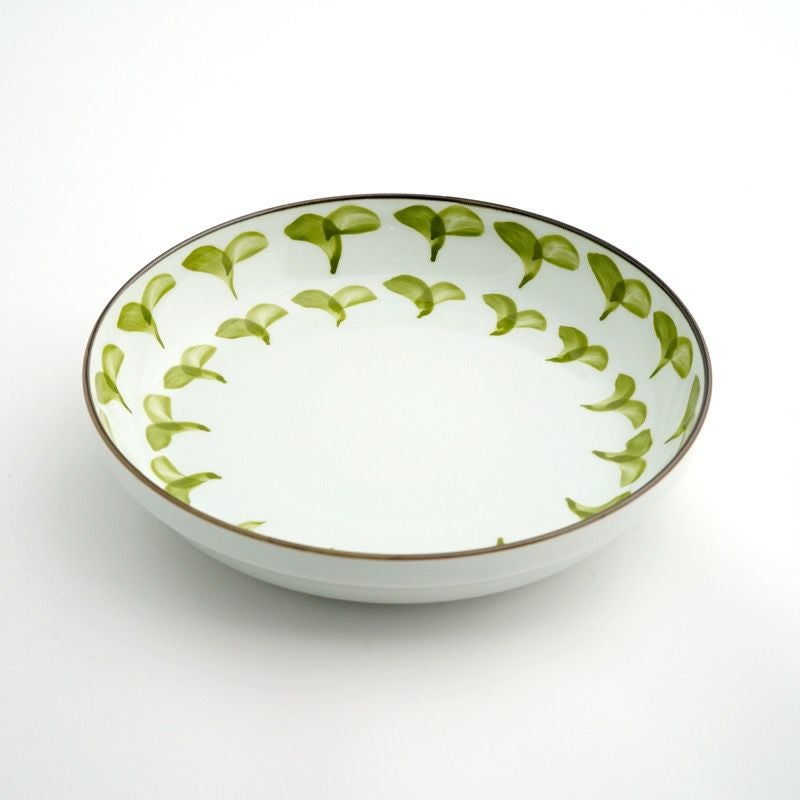 古くから日本人に愛されたその古典文様を、独特の渋さを持つ緑の織部釉とやや赤みがかった白の志野釉で塗り分け、京らしい季節の絵柄をちりばめた、職人の手仕事を感じさせる一皿です。
