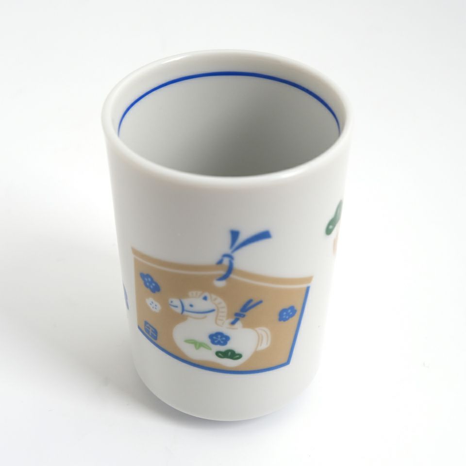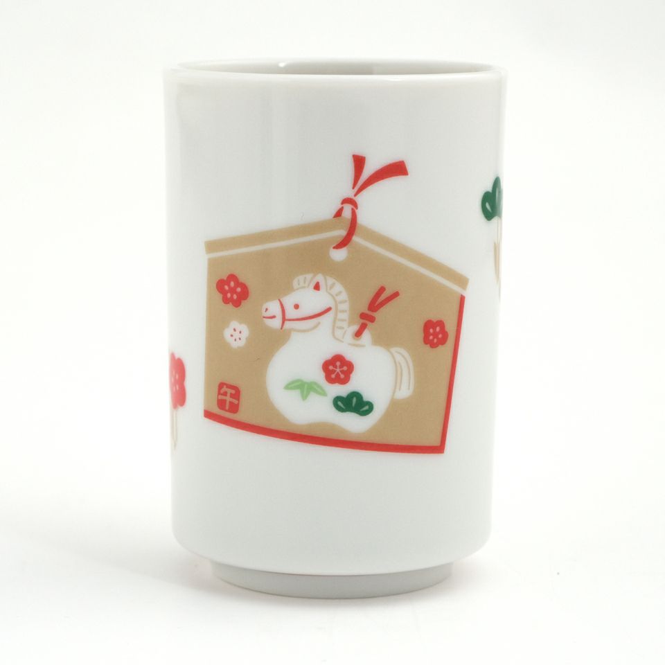 絵馬に令和8年の干支「午」を可愛らしくデザインした湯呑です。願い事を書いて納める絵馬柄のお湯呑は、「よい年でありますように」の願いと、寿ぎの気持ちを込めた縁起のうつわです。なくなり次第終了となります。