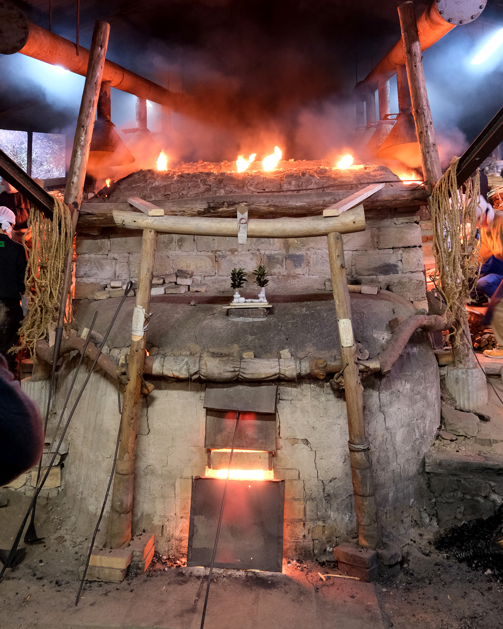 窯の前方には、倒れこみを防ぐための力強い木組み「鳥居」が構え厳かな存在感を放っています。