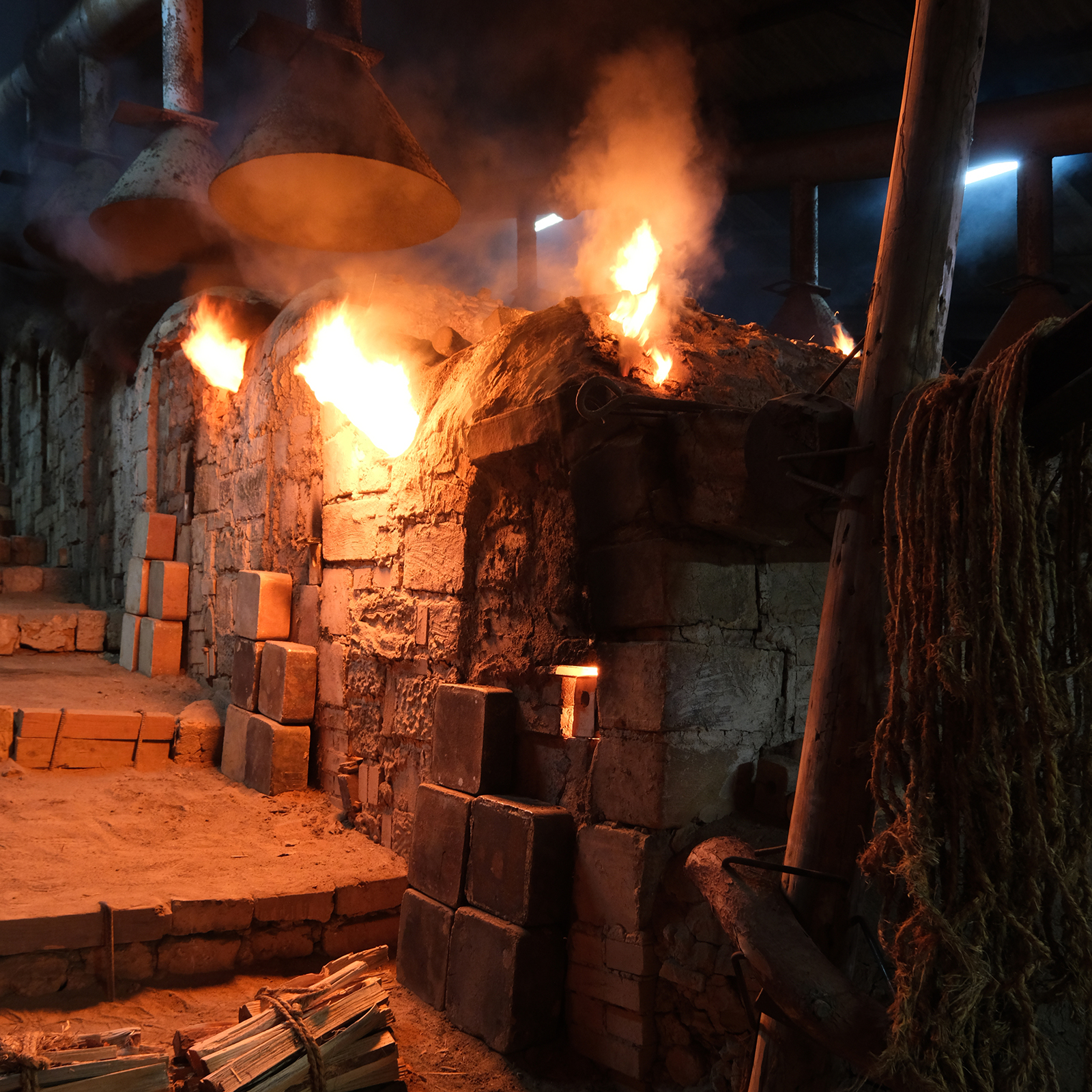 「色見穴(いろみあな)」と呼ばれる小窓からは、室内の炎に包まれた作品の表情を目視で確認、時折「色見本」という小さな陶片を取り出して、焼成の進み具合を確かめます。