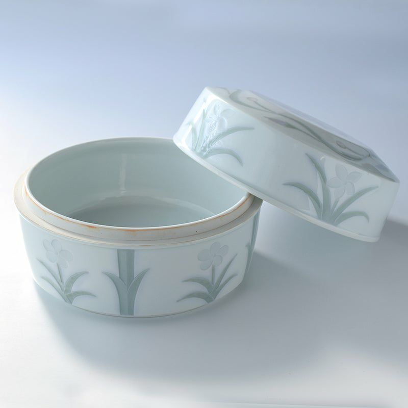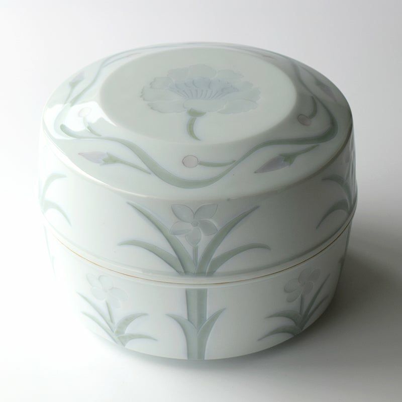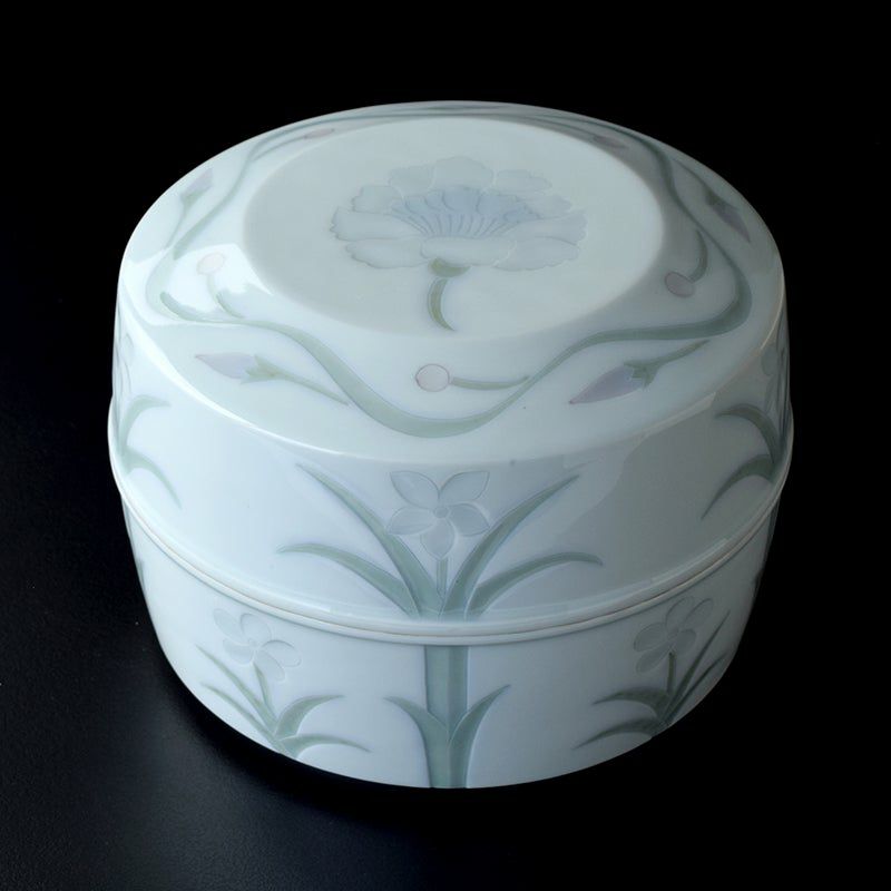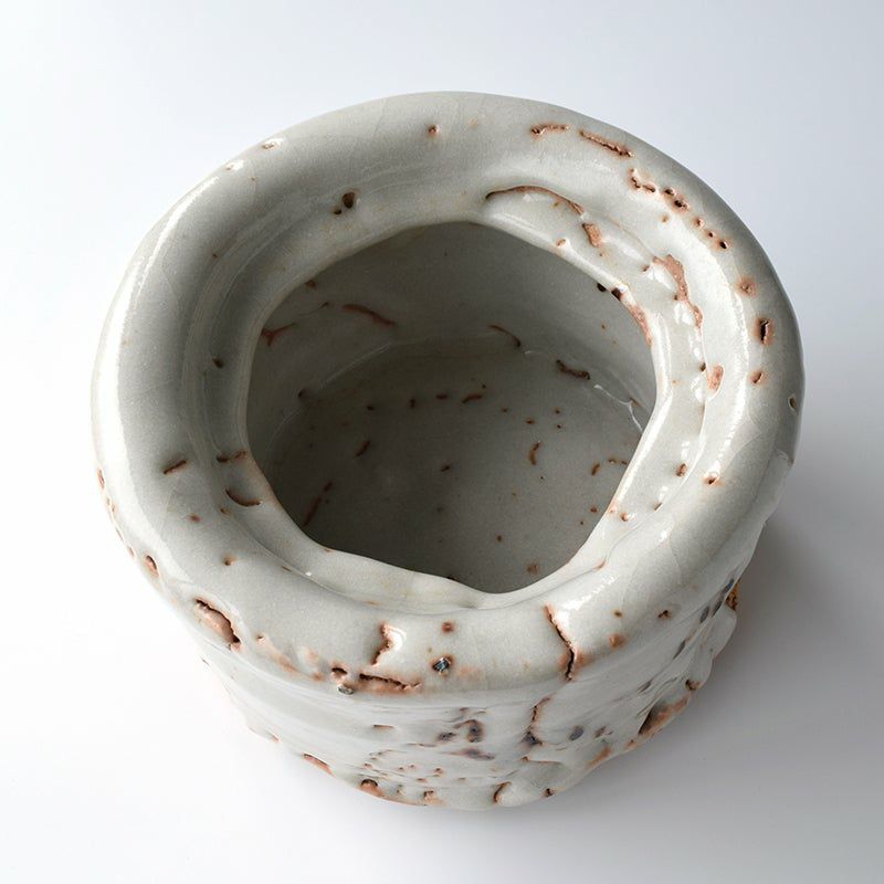 線彫りや刻印で連続文様を施し、白土を埋め込んだ印花(いんか)という技法が特徴の三島手を得意とし、大小の花模様が魅せるレースのような装飾は繊細で華やか。